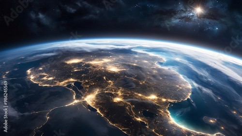 Fototapeta premium Panoramic view of Earth from space glowing city lights, light clouds, and the...
