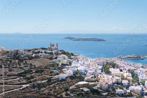 © Haris Andronos, Naklejka premium Panoramic view of Ermoupoli city of Syros Island in Cyclades, Greece. Top view of the colorful houses, the port and the Orthodox Anastaseos church
