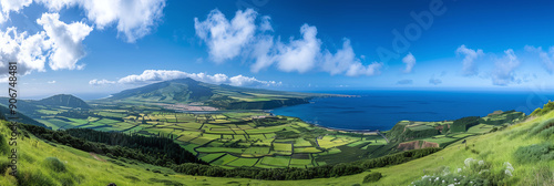© Pierre Villecourt, Fototapeta premium Panoramic View of Faial Island's Green Fields and Coastline, Azores, Portugal