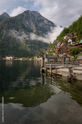 © JMDuran Photography, Fototapeta premium Panoramic view of famous old town Hallstatt and alpine deep blue lake in scenic sunrise light on a beautiful day in summer, Salzkammergut, Austria