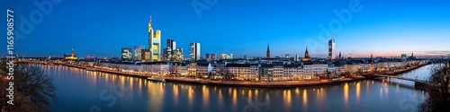 Obraz premium Panoramic View of Frankfurt Skyline at Night with Illuminated Buildings and...