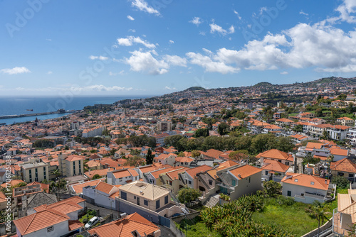 Obraz premium Panoramic View of Funchal City with Red Tiled Roofs and Ocean, Madeira, Portugal