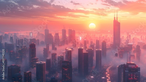 © Thares2020, Fototapeta premium Panoramic View of Futuristic City with High Rise Buildings and Flying Cars at Dawn