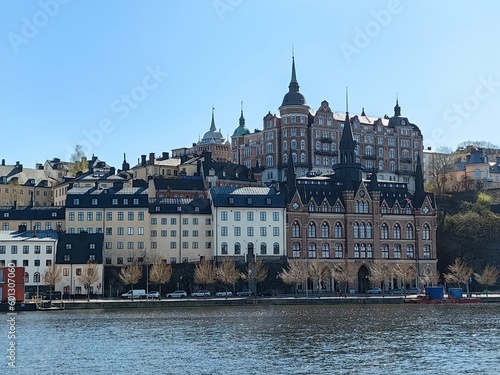 © Krzysztof, Obraz premium Panoramic view of Gamla Stan - the old town of Stockholm against the backdrop of water and blue sky.