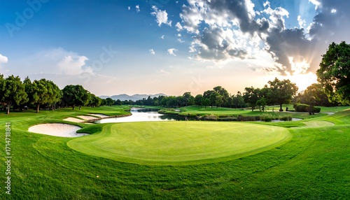 © CreativeCreations, Obraz premium Panoramic view of golf course, golf field with a rich green turf beautiful scenery