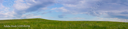 Obraz premium Panoramic view of green grass and blue sky with clouds. The horizon line at...