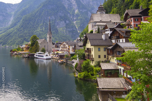 Naklejka premium Panoramic view of Hallstatt village, and lake in Austria. Hallstatt village...
