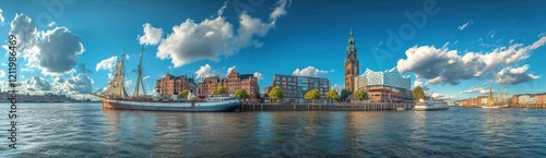 © ANUAR, Naklejka premium Panoramic View of Historic Waterfront with Sailing Ship, Iconic Architecture, Bright Blue Sky, Fluffy Clouds, and Reflections on Calm Water in Urban Cityscape