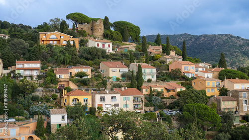 © jtamm, Obraz premium Panoramic view of houses and roofs of medieval village of Bormes-les-Mimosas, in the Var, in Provence, France