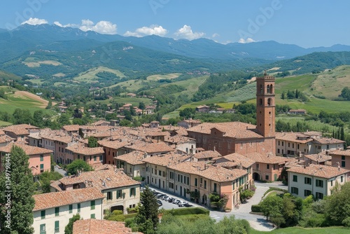 Fototapeta premium Panoramic View of Italian Village Nestled in Rolling Hills and Mountains
