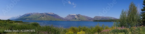Naklejka premium Panoramic view of Jenny Lake bordered by colorful flowers at the Grand Teton...