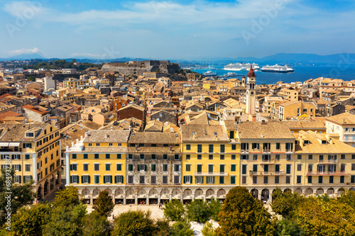 Obraz premium Panoramic view of Kerkyra, capital of Corfu island, Greece. Aerial drone view of Kerkyra with beautiful buildings during summer sunny day. Corfu island, Greece.