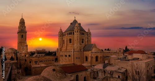 Fototapeta premium Panoramic View of King David's Tomb in the Old City. Colorful Sunset Artistic...