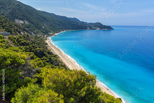 Fototapeta premium Panoramic view of Kokkinos Vrachos Beach with blue waters, Lefkada, Ionian...