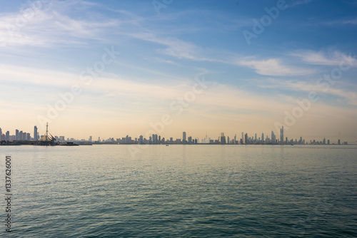 Naklejka premium Panoramic View of Kuwait City Skyline with Calm Arabian Gulf Waters and...