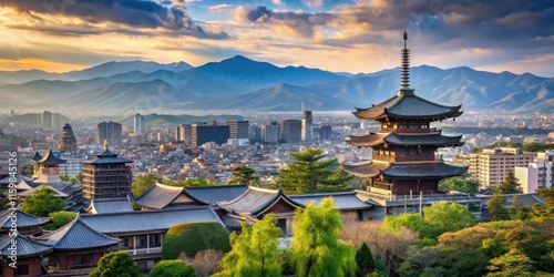© udomsak, Obraz premium Panoramic view of Kyoto city skyline with traditional temples and mountains in the background, Kyoto, Japan, cityscape
