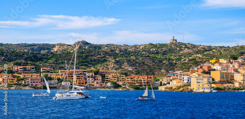 Fototapeta premium Panoramic view of La Maddalena old town quarter in Sardinia, Italy with port...