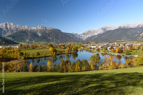 Obraz premium Panoramic view of Lake Ritzensee and Saalfelden on a sunny autumn day in with...