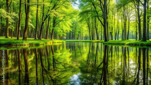 © suchetpong, Fototapeta premium Panoramic view of lush deciduous forest with tall trees and soft green grass