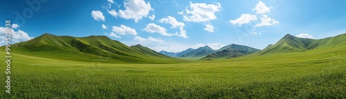 Fototapeta premium Panoramic View of Lush Green Hills and Blue Sky with Fluffy Clouds on a Sunny...