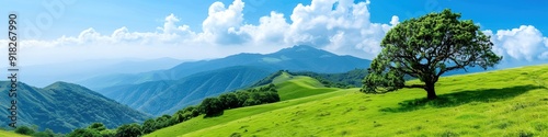 © Inlovehem, Obraz premium Panoramic view of lush green hills with a solitary tree and blue sky. Serene landscape with mountains in the background on a sunny day.