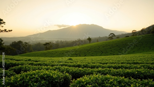 © Teerapol, Fototapeta premium Panoramic View of Lush Green Tea Plantation at Golden Hour