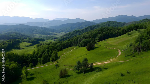 © artzone, Fototapeta premium Panoramic View Of Lush Green Valley And Hills