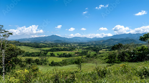 Fototapeta premium Panoramic View Of Lush Green Valley And Mountains Under A Sunny Sky
