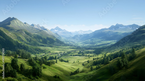 © artzone, Fototapeta premium Panoramic View Of Lush Green Valley Between Mountains
