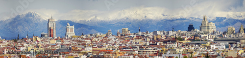 Obraz premium Panoramic view of Madrid, the capital of Spain, with the partially snow-covered mountains in the background.