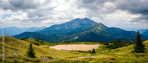© artzone, Fototapeta premium Panoramic View of Majestic Mountain Peak With An Alpine Lake And Cloudy Sky In The Background