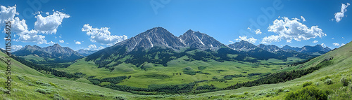 © sonswirl, Obraz premium Panoramic view of majestic mountains under a vibrant blue sky.