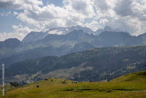 © Roberto, Naklejka premium Panoramic view of Marmolada Mountain and Glacier, from Pralongia over Corvara, Alta Badia, Dolomites , Trentino, Alto Adige, Sudtirol, South Tyrol, Italy