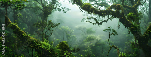Fototapeta premium Panoramic view of misty rainforest trees with fog and rays, showcasing the...