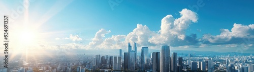 Fototapeta premium Panoramic View of Modern City Skyline with Skyscrapers and Blue Sky on a Sunny Day