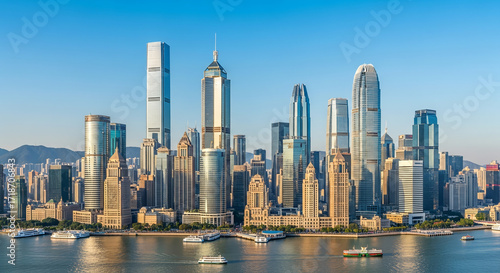 © Eko, Fototapeta premium Panoramic View of Modern Skyscrapers Against a Clear Blue Sky