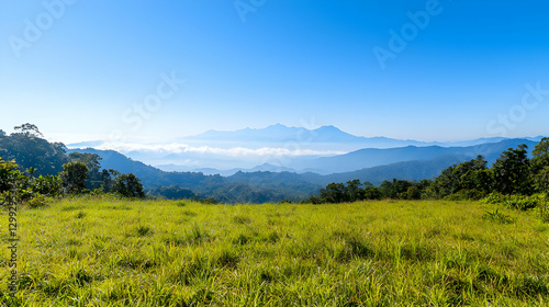 © artzone, Fototapeta premium Panoramic View Of Mountain Landscape With Green Fields And Blue Sky