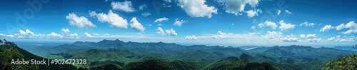 Fototapeta premium panoramic view of mountains with forest, sunny day, blue sky,