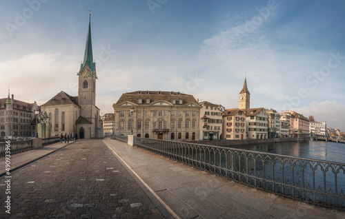 Naklejka premium Panoramic view of Munsterbrucke Bridge with Fraumunster Church and St Peters...