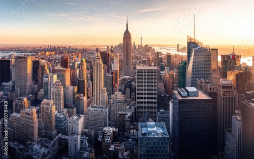 Fototapeta premium Panoramic view of New York City skyline at sunset. A vast array of skyscrapers, stretching across the urban landscape, bathed in warm golden hues as the sun dips below the horizon