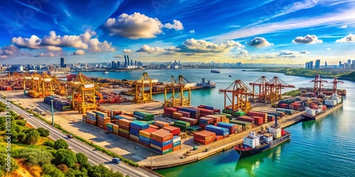 Obraz premium Panoramic View of Nhava Sheva Port: A Bustling Maritime Hub with Cargo Ships,...