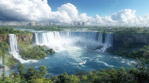 Fototapeta premium Panoramic view of Niagara Falls, lush greenery, city skyline, cascading...