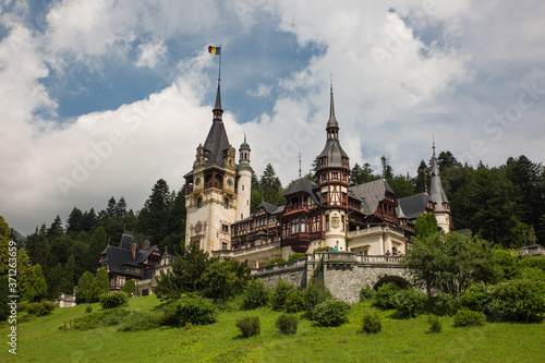 © Natalia, Fototapeta premium Panoramic view of Peles Castle, Romania. Famous Neo-Renaissance castle and ornamental garden in Sinaia, Carpathian Mountains in Europe.