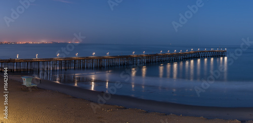 © motionshooter, Fototapeta premium Panoramic view of pier illuminated by lamps at dawn.
