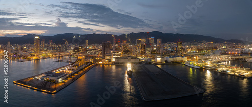 © Osaze, Fototapeta premium Panoramic view of piers and harbor against city skyline lights at sunset