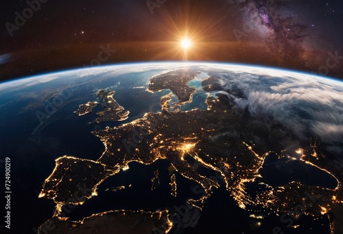 Fototapeta premium panoramic view of planet Earth from space, with city lights glowing and light...