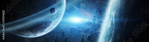 © sdecoret, Naklejka premium Panoramic view of planets in distant solar system 3D rendering elements of this image furnished by NASA
