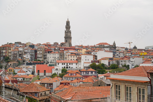 Fototapeta premium Panoramic view of Porto with red-tiled roofs, historic bell tower, and...