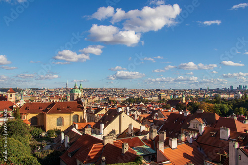Obraz premium Panoramic View of Prague with Red Roofs and Blue Sky. Panoramic view of a European city with red-tiled roofs, church spires, lush greenery, and a bright blue sky with clouds.