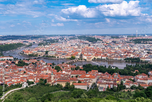 © photoworld, Obraz premium Panoramic view of Prague with the Vltava River, historic bridges, and red rooftops, surrounded by lush greenery. Stunning European cityscape showcasing Czech Republic’s architectural and natural beaut